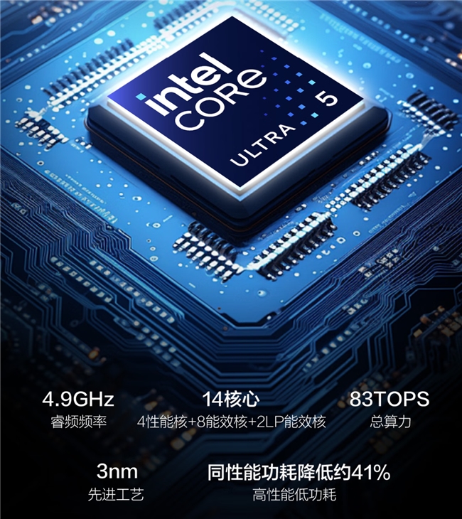 华硕破晓6S 幻金版搭载英特尔酷睿Ultra5-225H处理器,采用先进的3nm制程工艺,拥有14核14线程架构,最高睿频可达4.9GHz。配合32GB DDR5-5600MHz高频内存与1TB PCIe 4.0 SSD,无论是处理大型数据表格、同时运行多个专业软件,还是进行轻量级的视频剪辑与平面设计,都能保持系统响应迅速、运行流畅。处理器集成Intel® Arc™ 130T核显,至高可提供83TOPS的AI总算力,可用户在文生文、文生图等智能办公场景注入强劲动能。