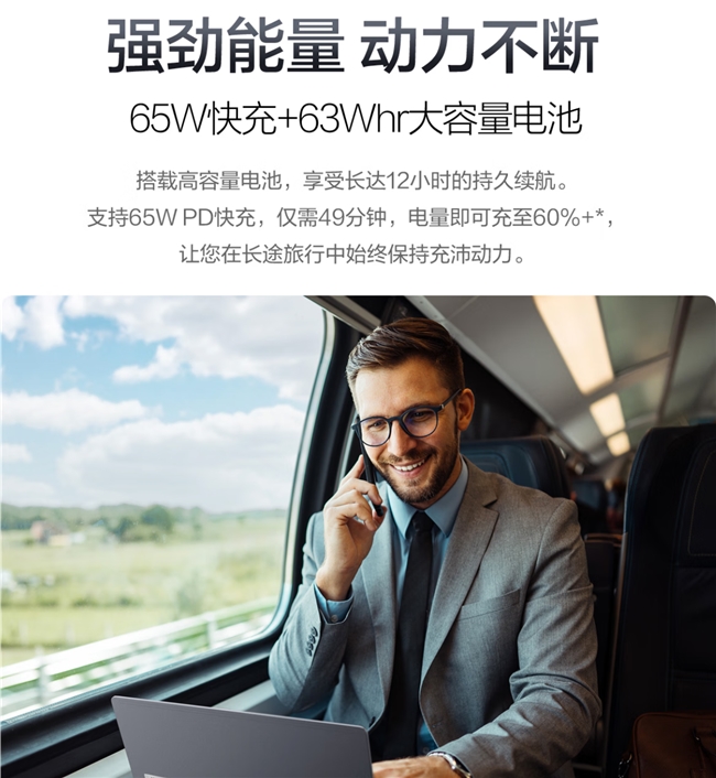 内置63Whr大容量电池,配合高能效处理器与智能电源管理技术,可支持用户长达12小时的连续使用,轻松覆盖全天会议或长途差旅办公需求。65W PD快充技术的加入,让电量在49分钟内即可恢复至60%以上,用户利用会议间隙或休息时间快速补电,确保设备随时处于“战备状态”。